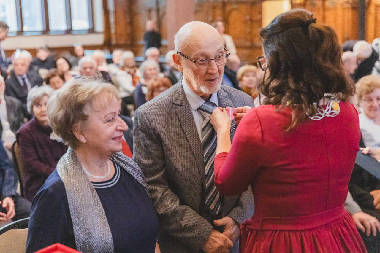 Gdańsk. Dwór Artusa. Jubileusz Par Małżeńskich - Złote Gody, podczas których Prezydent Gdańska Aleksandra Dulkiewicz wręczyła medale za długoletnie pożycie małżeńskie