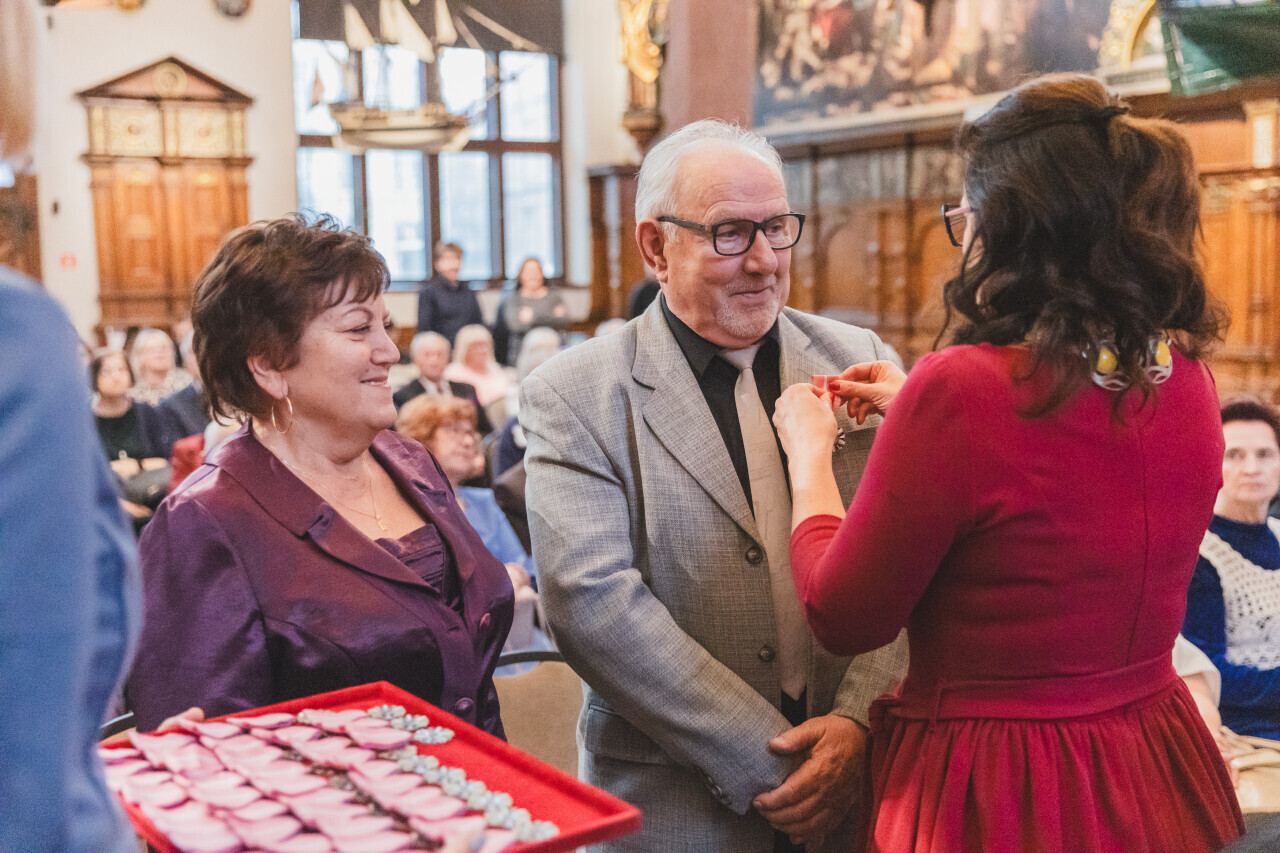 Gdańsk. Dwór Artusa. Jubileusz Par Małżeńskich - Złote Gody, podczas których Prezydent Gdańska Aleksandra Dulkiewicz wręczyła medale za długoletnie pożycie małżeńskie