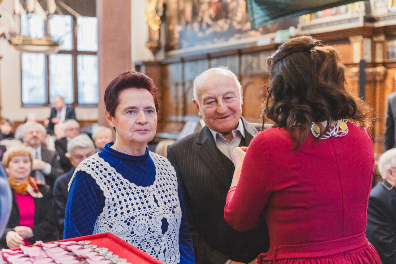 Gdańsk. Dwór Artusa. Jubileusz Par Małżeńskich - Złote Gody, podczas których Prezydent Gdańska Aleksandra Dulkiewicz wręczyła medale za długoletnie pożycie małżeńskie
