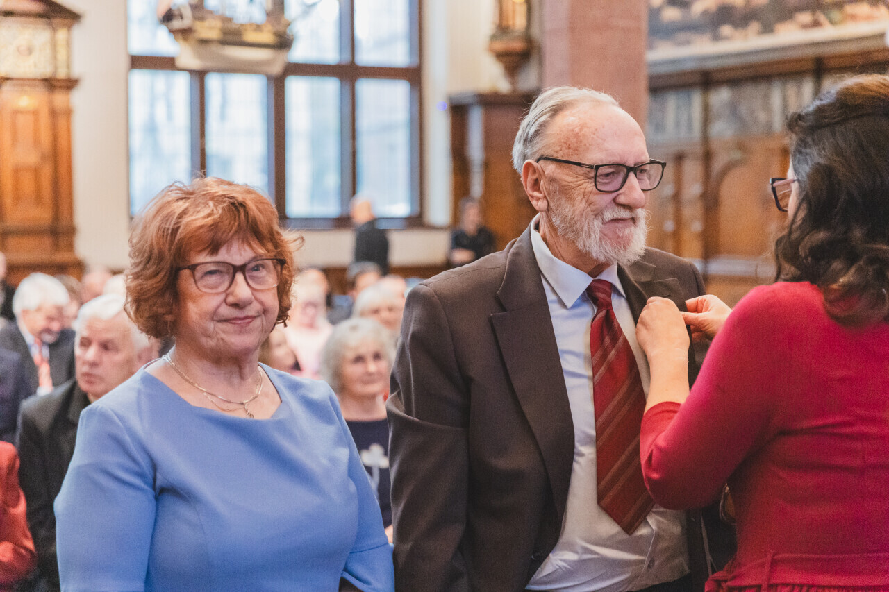 Gdańsk. Dwór Artusa. Jubileusz Par Małżeńskich - Złote Gody, podczas których Prezydent Gdańska Aleksandra Dulkiewicz wręczyła medale za długoletnie pożycie małżeńskie