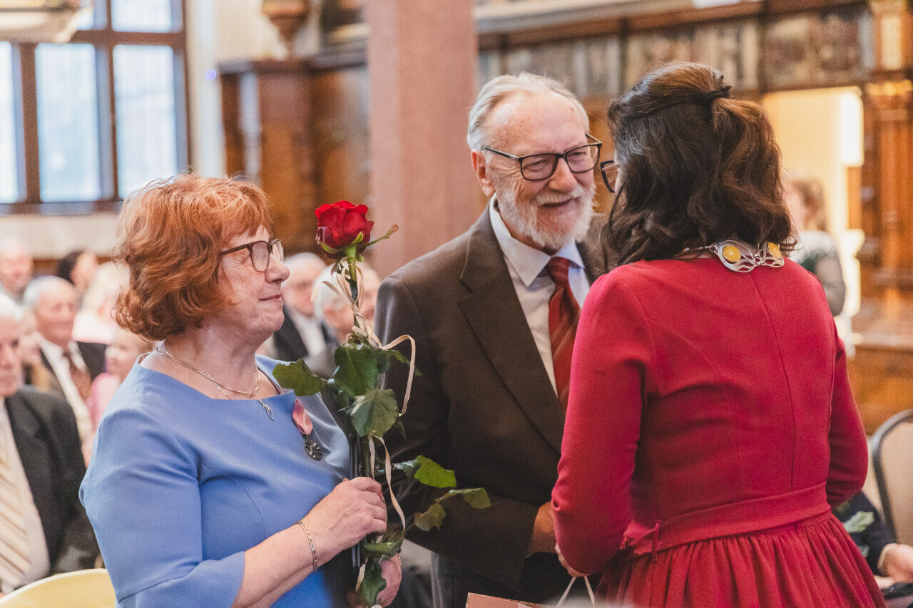 Gdańsk. Dwór Artusa. Jubileusz Par Małżeńskich - Złote Gody, podczas których Prezydent Gdańska Aleksandra Dulkiewicz wręczyła medale za długoletnie pożycie małżeńskie