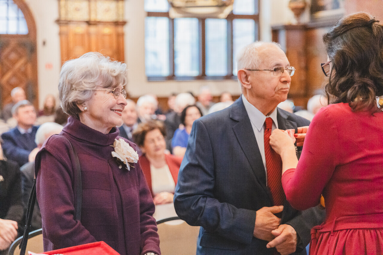 Gdańsk. Dwór Artusa. Jubileusz Par Małżeńskich - Złote Gody, podczas których Prezydent Gdańska Aleksandra Dulkiewicz wręczyła medale za długoletnie pożycie małżeńskie