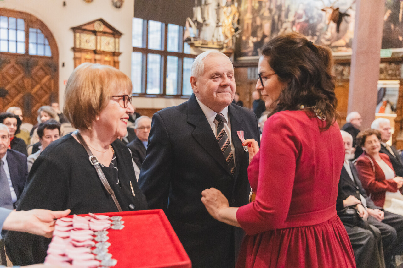 Gdańsk. Dwór Artusa. Jubileusz Par Małżeńskich - Złote Gody, podczas których Prezydent Gdańska Aleksandra Dulkiewicz wręczyła medale za długoletnie pożycie małżeńskie