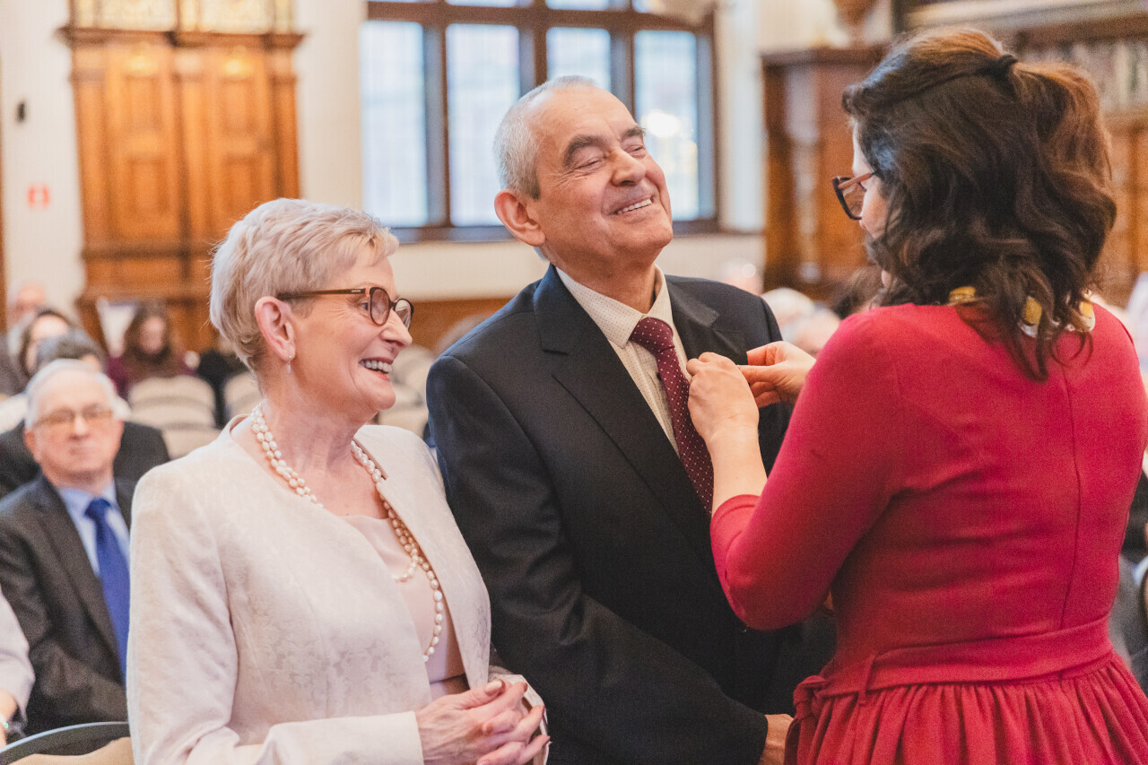Gdańsk. Dwór Artusa. Jubileusz Par Małżeńskich - Złote Gody, podczas których Prezydent Gdańska Aleksandra Dulkiewicz wręczyła medale za długoletnie pożycie małżeńskie