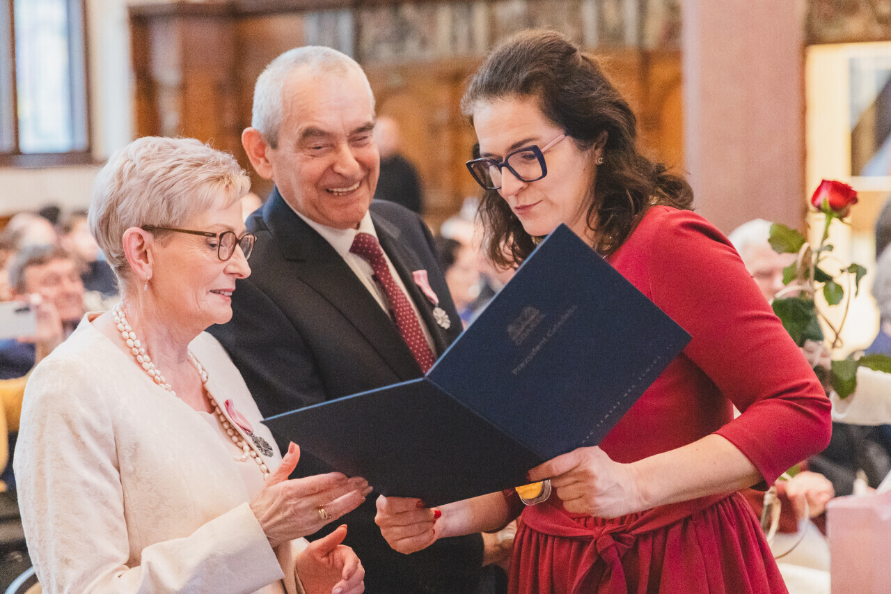 Gdańsk. Dwór Artusa. Jubileusz Par Małżeńskich - Złote Gody, podczas których Prezydent Gdańska Aleksandra Dulkiewicz wręczyła medale za długoletnie pożycie małżeńskie