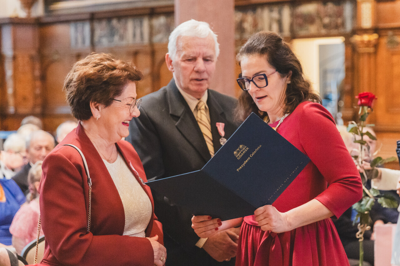Gdańsk. Dwór Artusa. Jubileusz Par Małżeńskich - Złote Gody, podczas których Prezydent Gdańska Aleksandra Dulkiewicz wręczyła medale za długoletnie pożycie małżeńskie