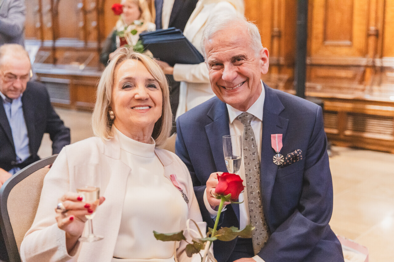 Gdańsk. Dwór Artusa. Jubileusz Par Małżeńskich - Złote Gody, podczas których Prezydent Gdańska Aleksandra Dulkiewicz wręczyła medale za długoletnie pożycie małżeńskie