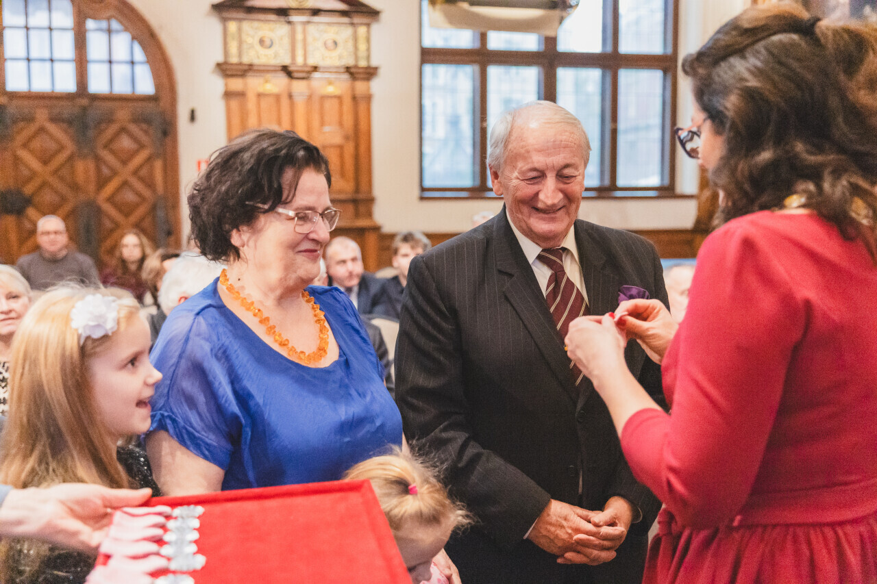 Gdańsk. Dwór Artusa. Jubileusz Par Małżeńskich - Złote Gody, podczas których Prezydent Gdańska Aleksandra Dulkiewicz wręczyła medale za długoletnie pożycie małżeńskie