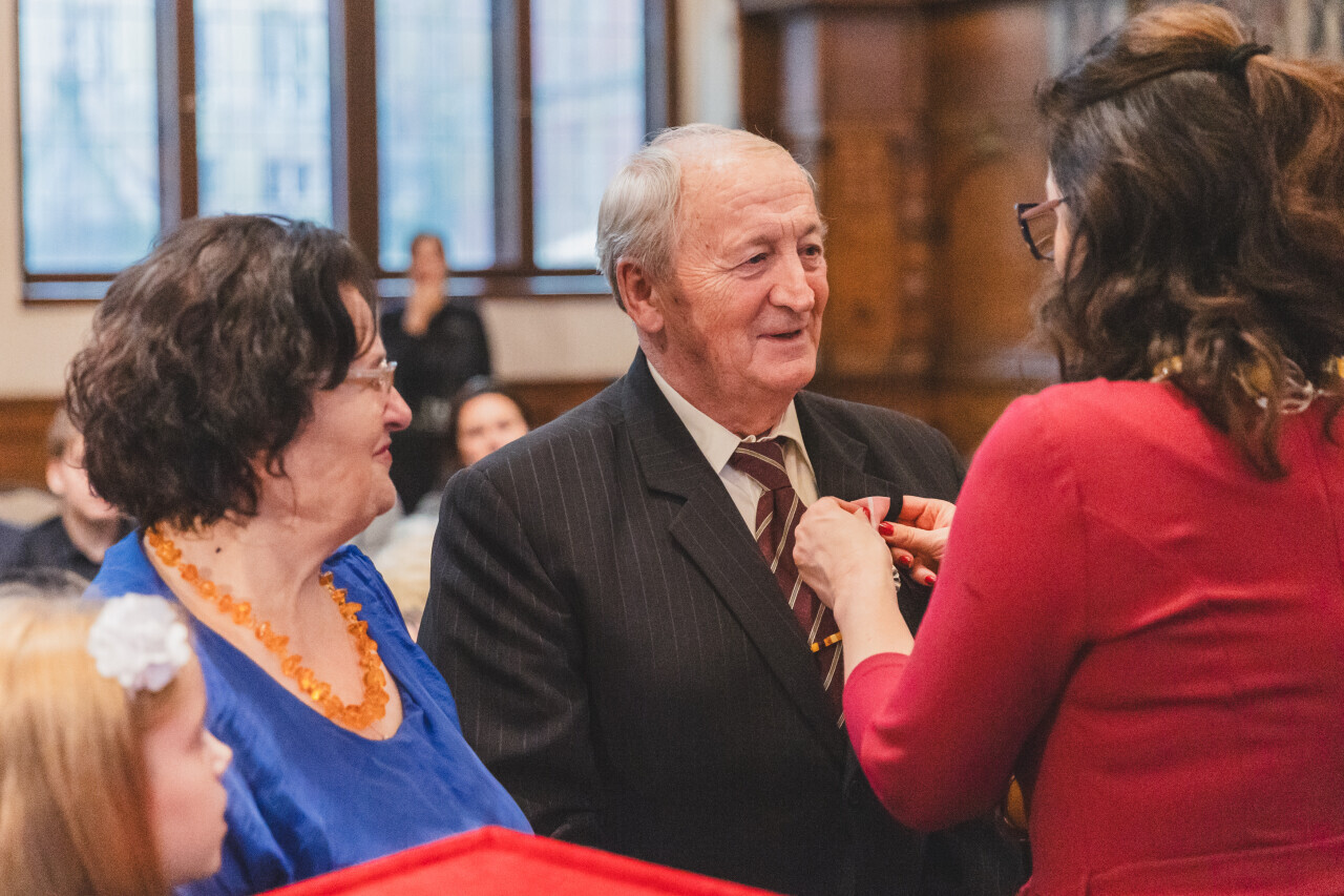 Gdańsk. Dwór Artusa. Jubileusz Par Małżeńskich - Złote Gody, podczas których Prezydent Gdańska Aleksandra Dulkiewicz wręczyła medale za długoletnie pożycie małżeńskie