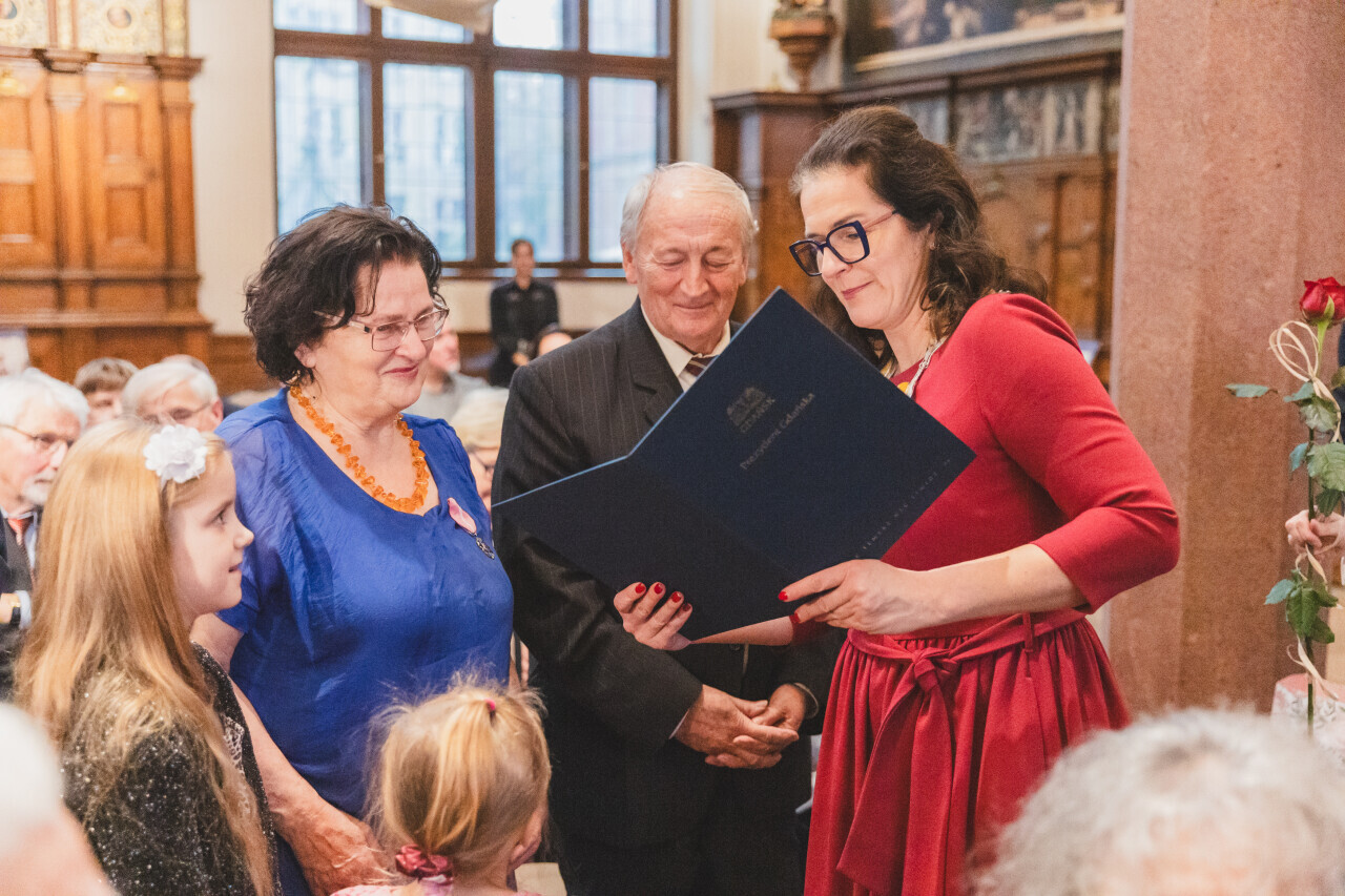 Gdańsk. Dwór Artusa. Jubileusz Par Małżeńskich - Złote Gody, podczas których Prezydent Gdańska Aleksandra Dulkiewicz wręczyła medale za długoletnie pożycie małżeńskie