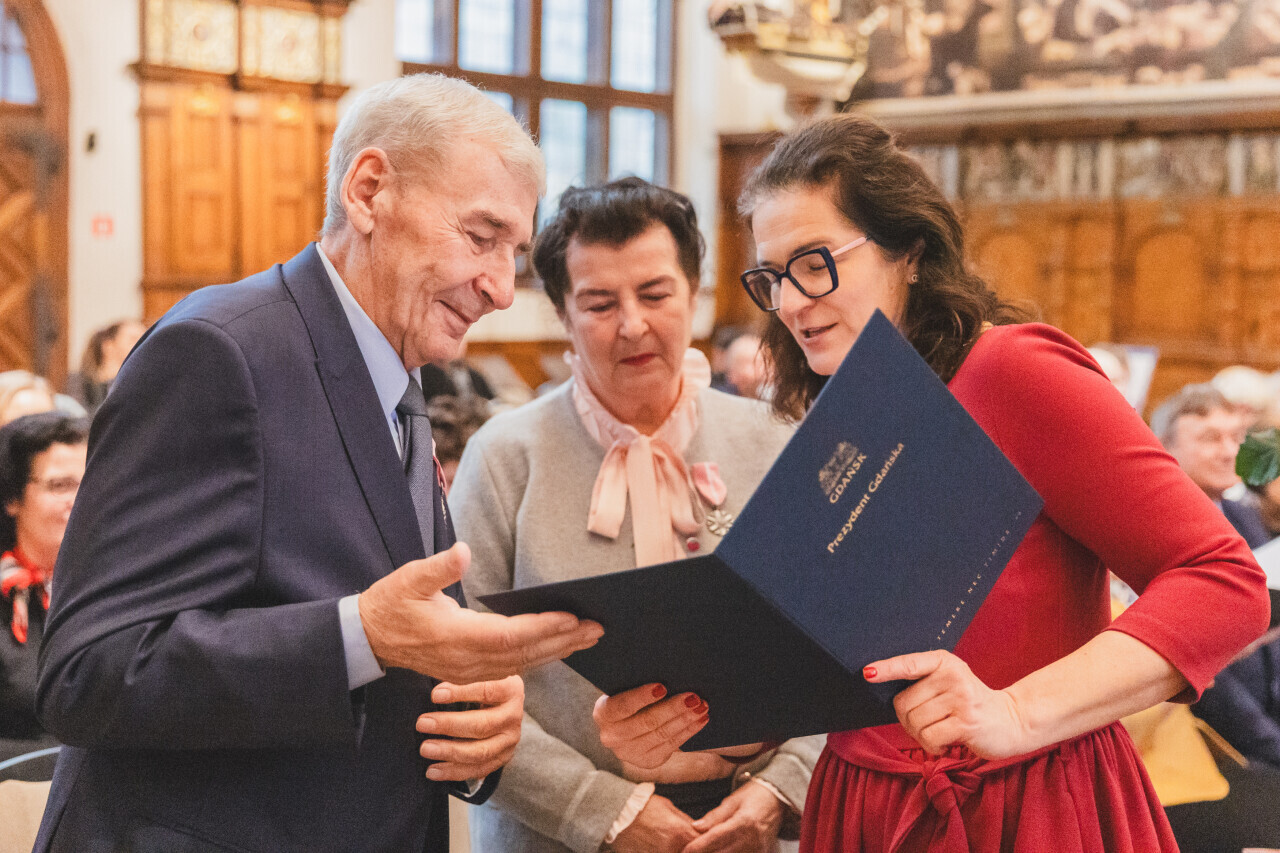 Gdańsk. Dwór Artusa. Jubileusz Par Małżeńskich - Złote Gody, podczas których Prezydent Gdańska Aleksandra Dulkiewicz wręczyła medale za długoletnie pożycie małżeńskie