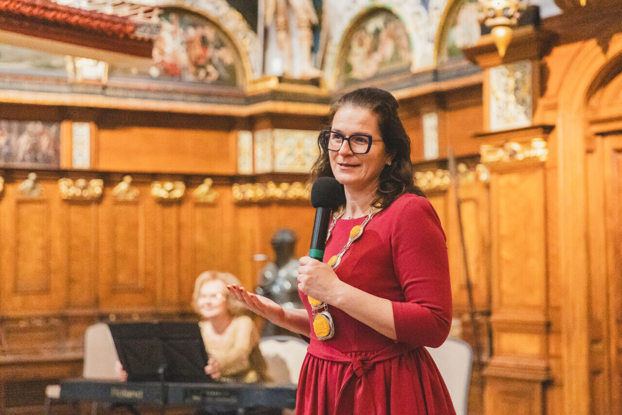 Gdańsk. Dwór Artusa. Jubileusz Par Małżeńskich - Złote Gody, podczas których Prezydent Gdańska Aleksandra Dulkiewicz wręczyła medale za długoletnie pożycie małżeńskie