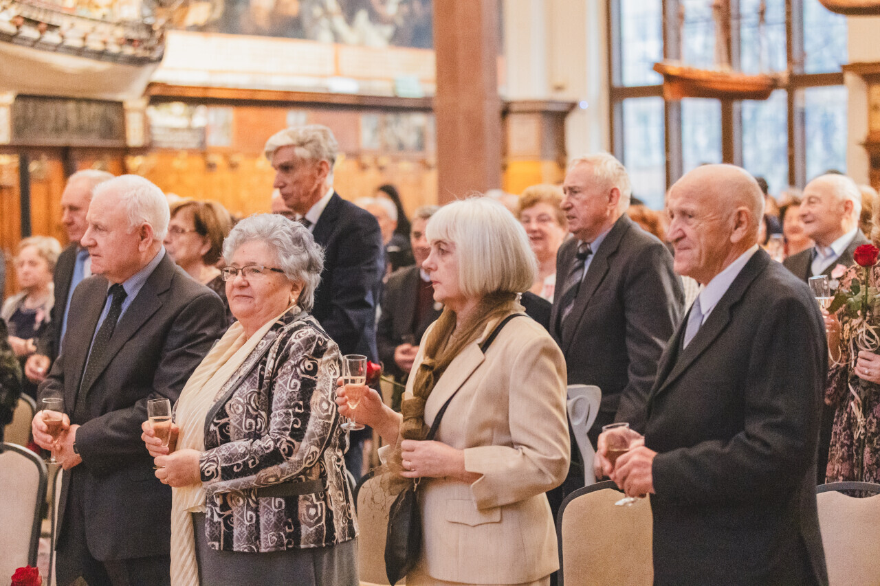 Gdańsk. Dwór Artusa. Jubileusz Par Małżeńskich - Złote Gody, podczas których Prezydent Gdańska Aleksandra Dulkiewicz wręczyła medale za długoletnie pożycie małżeńskie