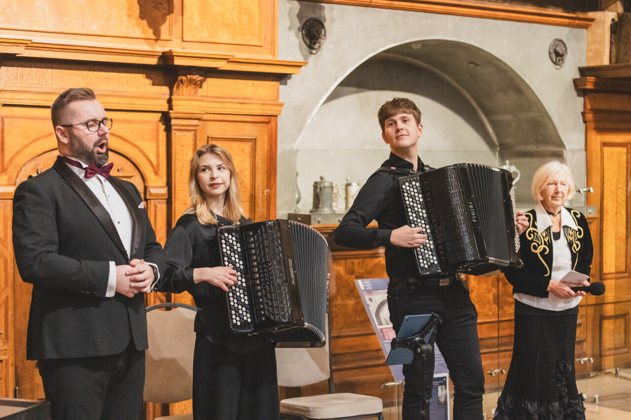 Gdańsk. Dwór Artusa. Jubileusz Par Małżeńskich - Złote Gody, podczas których Prezydent Gdańska Aleksandra Dulkiewicz wręczyła medale za długoletnie pożycie małżeńskie