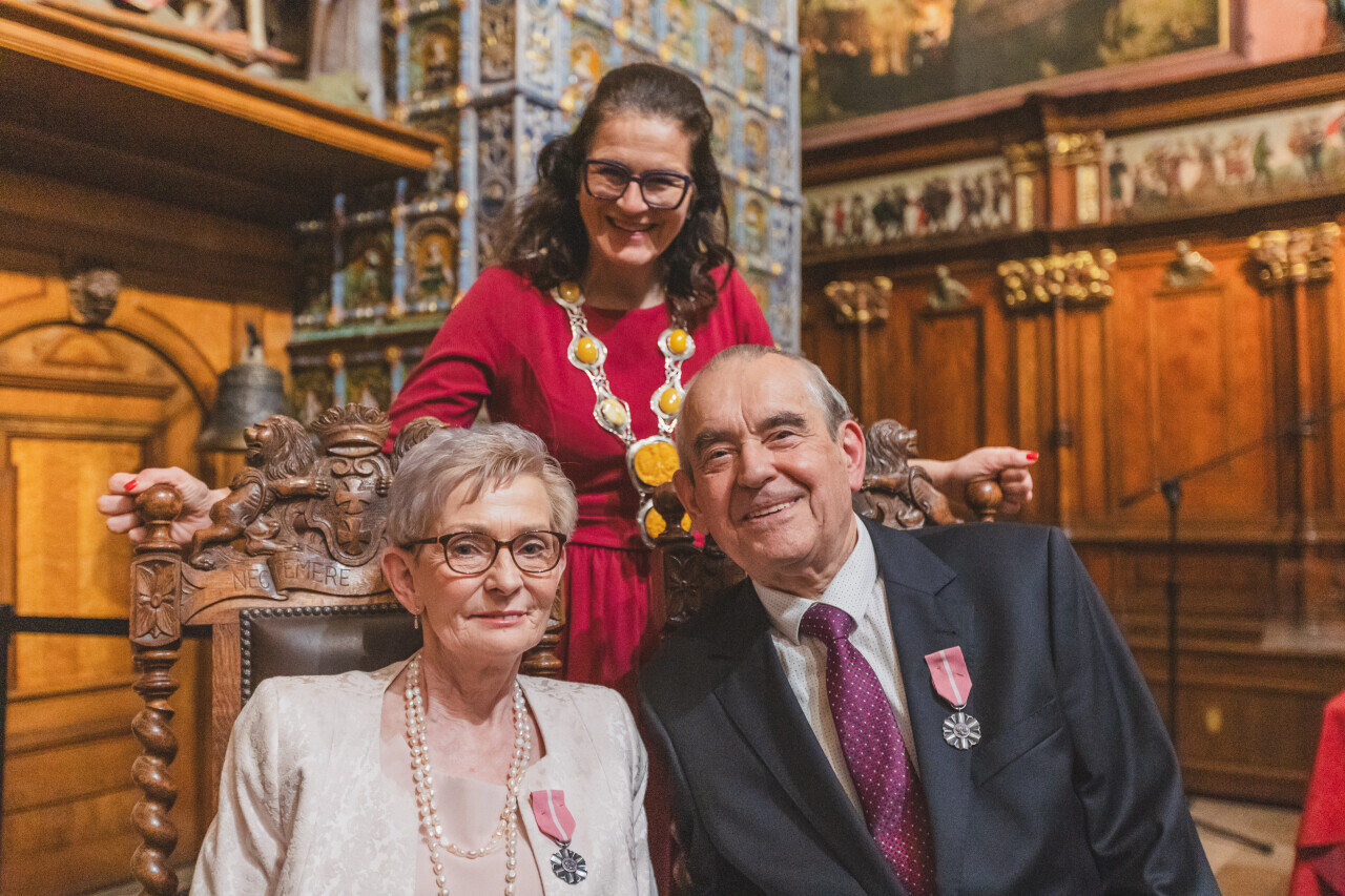 Gdańsk. Dwór Artusa. Jubileusz Par Małżeńskich - Złote Gody, podczas których Prezydent Gdańska Aleksandra Dulkiewicz wręczyła medale za długoletnie pożycie małżeńskie