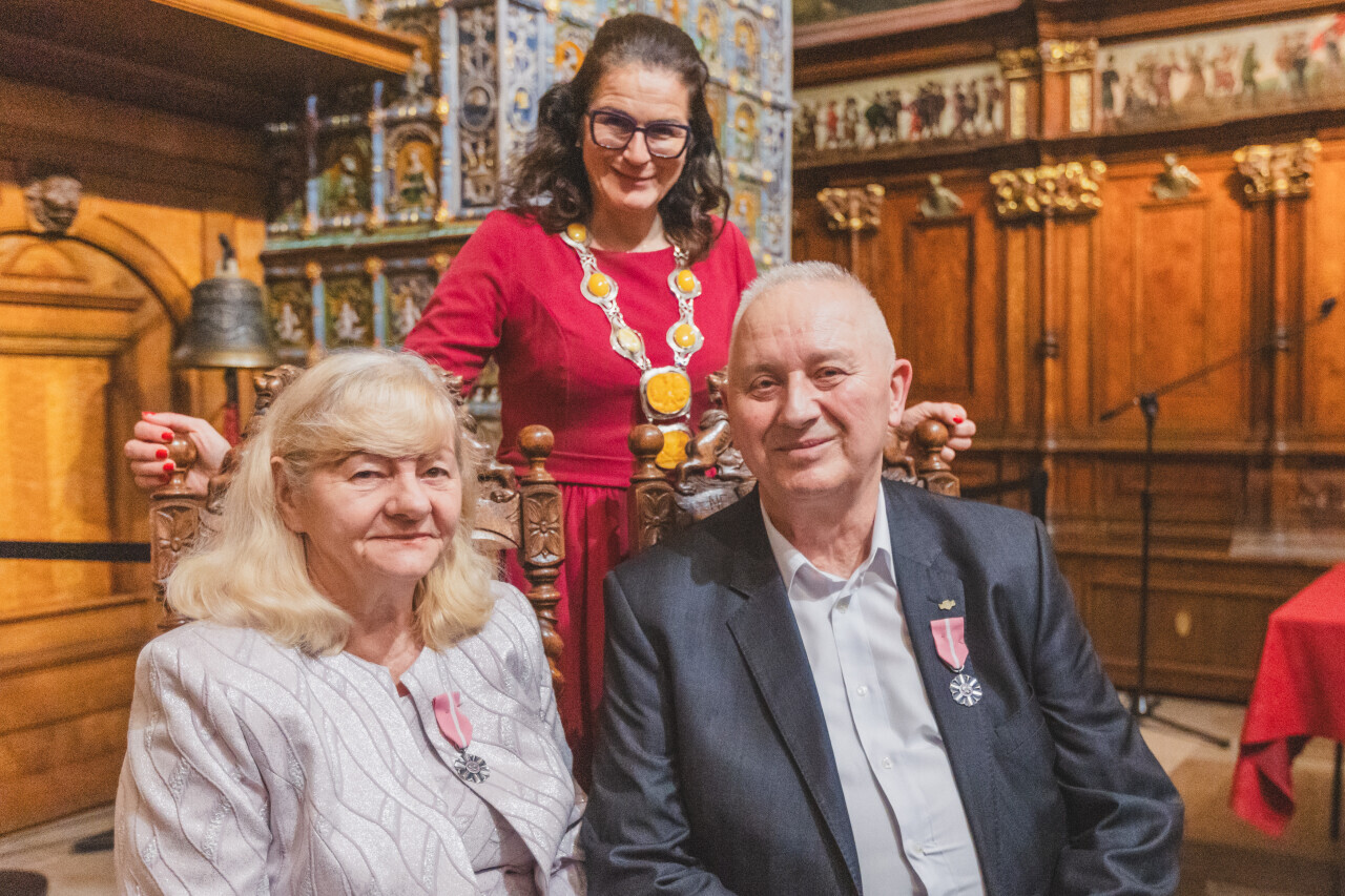 Gdańsk. Dwór Artusa. Jubileusz Par Małżeńskich - Złote Gody, podczas których Prezydent Gdańska Aleksandra Dulkiewicz wręczyła medale za długoletnie pożycie małżeńskie