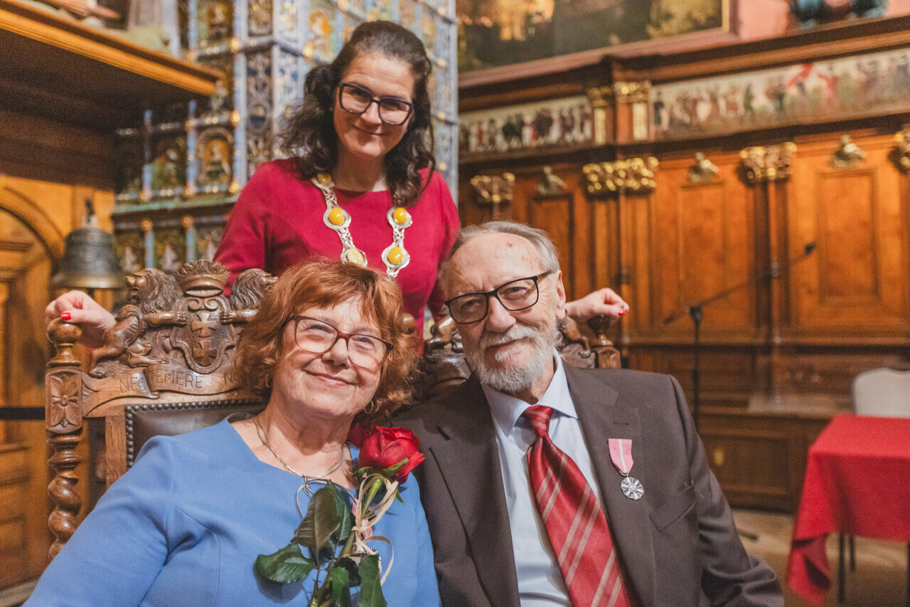 Gdańsk. Dwór Artusa. Jubileusz Par Małżeńskich - Złote Gody, podczas których Prezydent Gdańska Aleksandra Dulkiewicz wręczyła medale za długoletnie pożycie małżeńskie