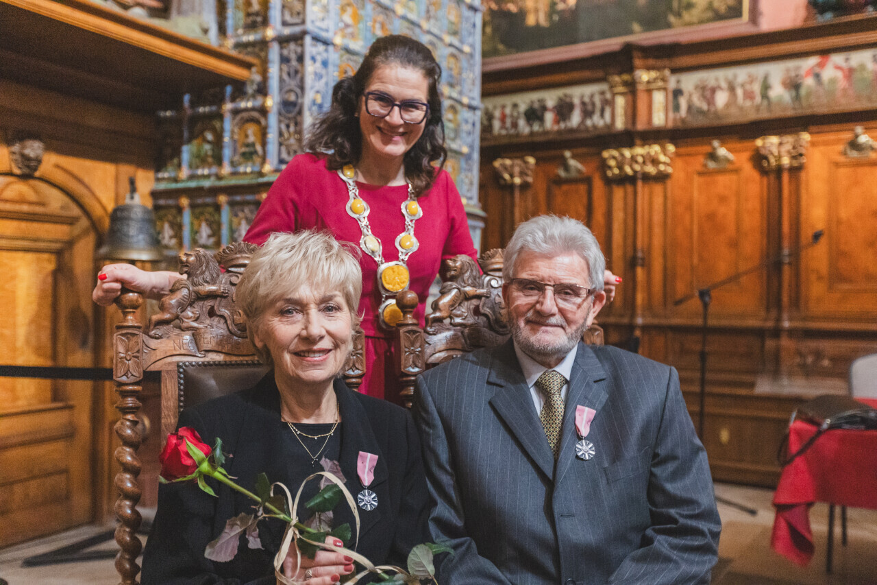 Gdańsk. Dwór Artusa. Jubileusz Par Małżeńskich - Złote Gody, podczas których Prezydent Gdańska Aleksandra Dulkiewicz wręczyła medale za długoletnie pożycie małżeńskie