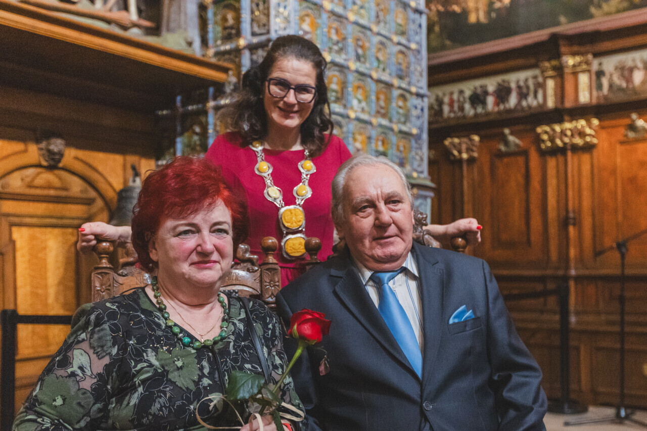 Gdańsk. Dwór Artusa. Jubileusz Par Małżeńskich - Złote Gody, podczas których Prezydent Gdańska Aleksandra Dulkiewicz wręczyła medale za długoletnie pożycie małżeńskie