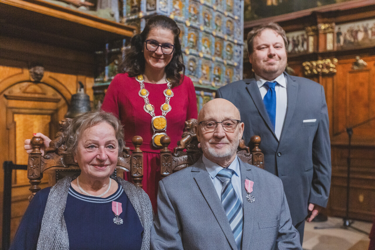 Gdańsk. Dwór Artusa. Jubileusz Par Małżeńskich - Złote Gody, podczas których Prezydent Gdańska Aleksandra Dulkiewicz wręczyła medale za długoletnie pożycie małżeńskie