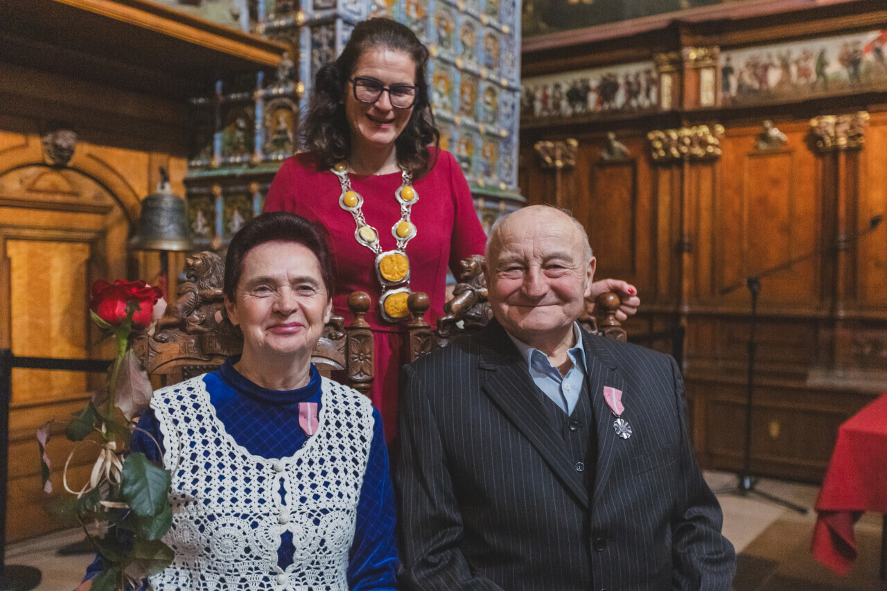 Gdańsk. Dwór Artusa. Jubileusz Par Małżeńskich - Złote Gody, podczas których Prezydent Gdańska Aleksandra Dulkiewicz wręczyła medale za długoletnie pożycie małżeńskie