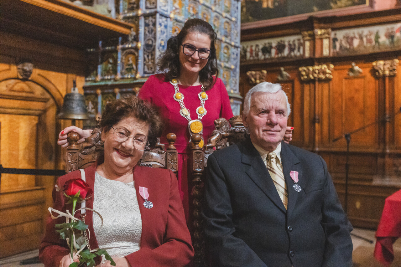 Gdańsk. Dwór Artusa. Jubileusz Par Małżeńskich - Złote Gody, podczas których Prezydent Gdańska Aleksandra Dulkiewicz wręczyła medale za długoletnie pożycie małżeńskie
