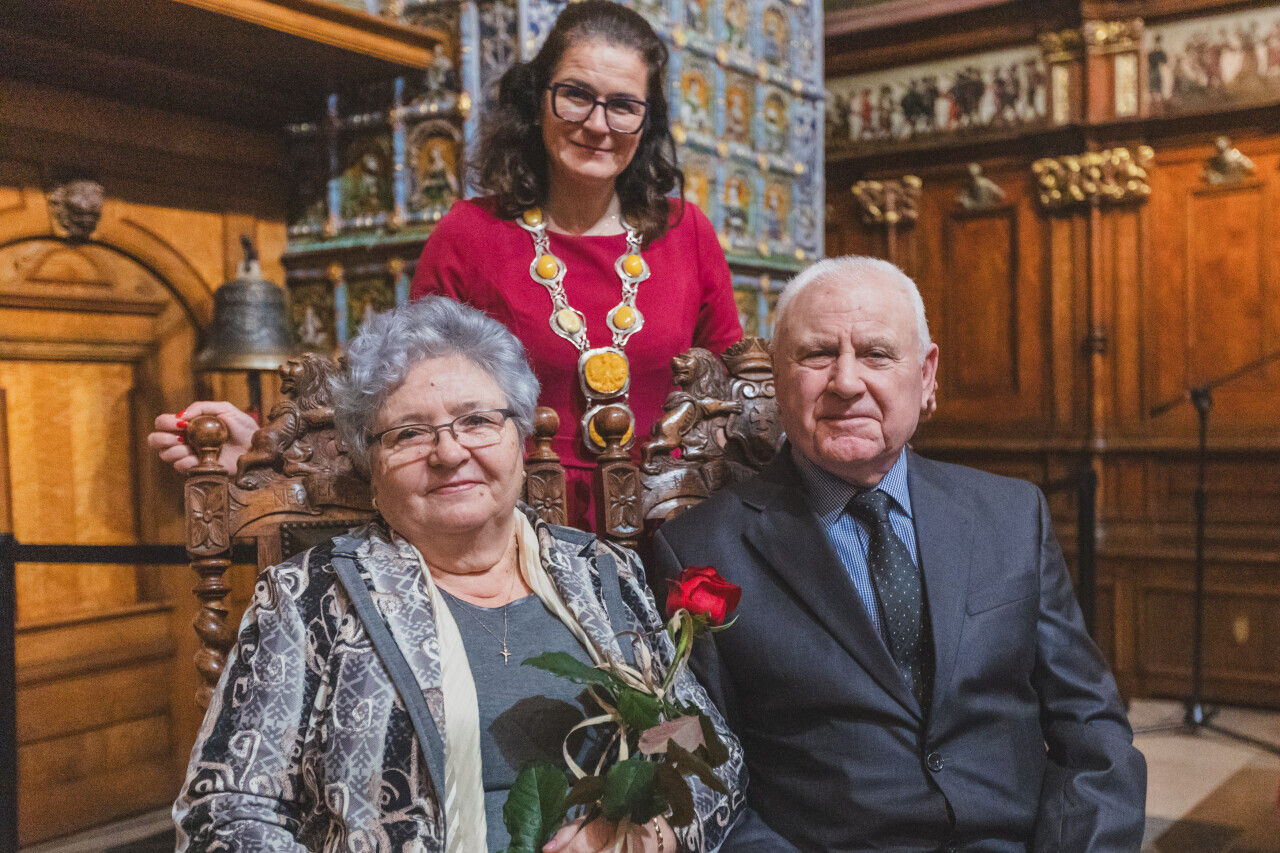Gdańsk. Dwór Artusa. Jubileusz Par Małżeńskich - Złote Gody, podczas których Prezydent Gdańska Aleksandra Dulkiewicz wręczyła medale za długoletnie pożycie małżeńskie