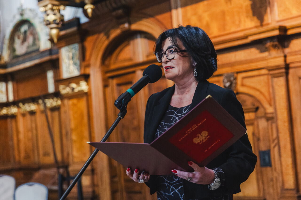 Gdańsk. Dwór Artusa. Jubileusz Par Małżeńskich - Złote Gody, podczas których Prezydent Gdańska Aleksandra Dulkiewicz wręczyła medale za długoletnie pożycie małżeńskie