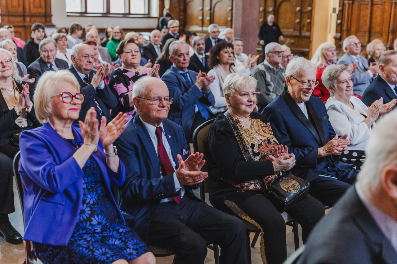 Gdańsk. Dwór Artusa. Jubileusz Par Małżeńskich - Złote Gody, podczas których Prezydent Gdańska Aleksandra Dulkiewicz wręczyła medale za długoletnie pożycie małżeńskie