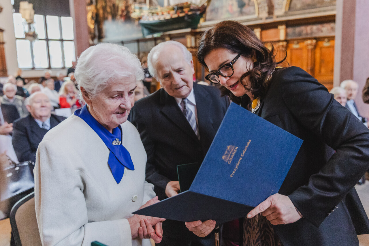 Gdańsk. Dwór Artusa. Jubileusz Par Małżeńskich - Złote Gody, podczas których Prezydent Gdańska Aleksandra Dulkiewicz wręczyła medale za długoletnie pożycie małżeńskie