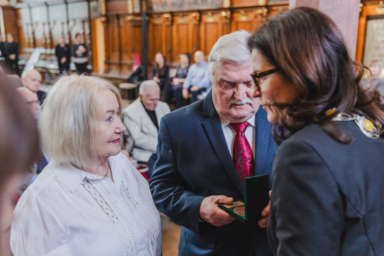 Gdańsk. Dwór Artusa. Jubileusz Par Małżeńskich - Złote Gody, podczas których Prezydent Gdańska Aleksandra Dulkiewicz wręczyła medale za długoletnie pożycie małżeńskie
