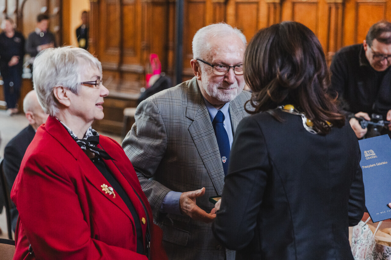 Gdańsk. Dwór Artusa. Jubileusz Par Małżeńskich - Złote Gody, podczas których Prezydent Gdańska Aleksandra Dulkiewicz wręczyła medale za długoletnie pożycie małżeńskie