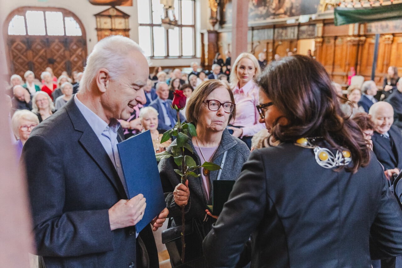 Gdańsk. Dwór Artusa. Jubileusz Par Małżeńskich - Złote Gody, podczas których Prezydent Gdańska Aleksandra Dulkiewicz wręczyła medale za długoletnie pożycie małżeńskie