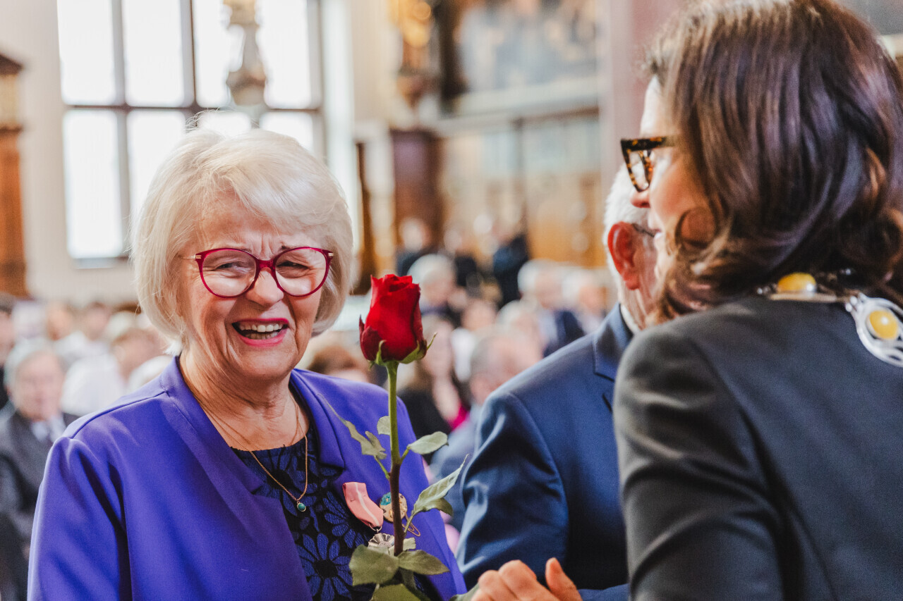 Gdańsk. Dwór Artusa. Jubileusz Par Małżeńskich - Złote Gody, podczas których Prezydent Gdańska Aleksandra Dulkiewicz wręczyła medale za długoletnie pożycie małżeńskie