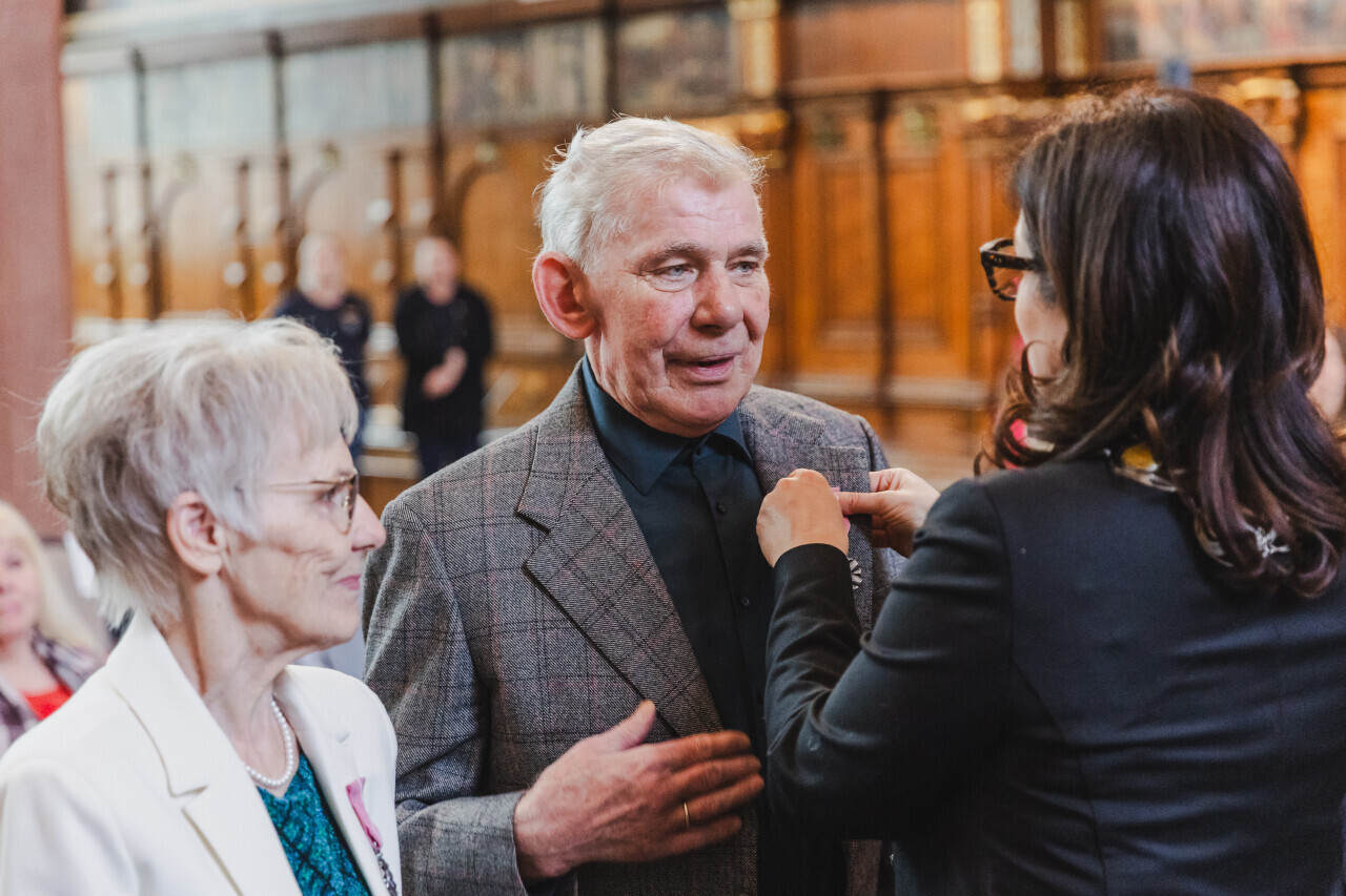 Gdańsk. Dwór Artusa. Jubileusz Par Małżeńskich - Złote Gody, podczas których Prezydent Gdańska Aleksandra Dulkiewicz wręczyła medale za długoletnie pożycie małżeńskie
