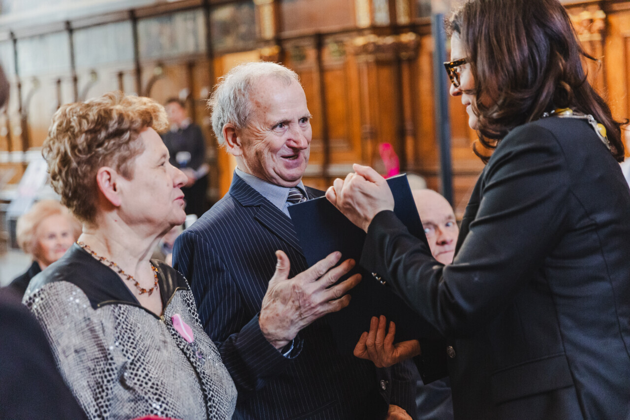 Gdańsk. Dwór Artusa. Jubileusz Par Małżeńskich - Złote Gody, podczas których Prezydent Gdańska Aleksandra Dulkiewicz wręczyła medale za długoletnie pożycie małżeńskie