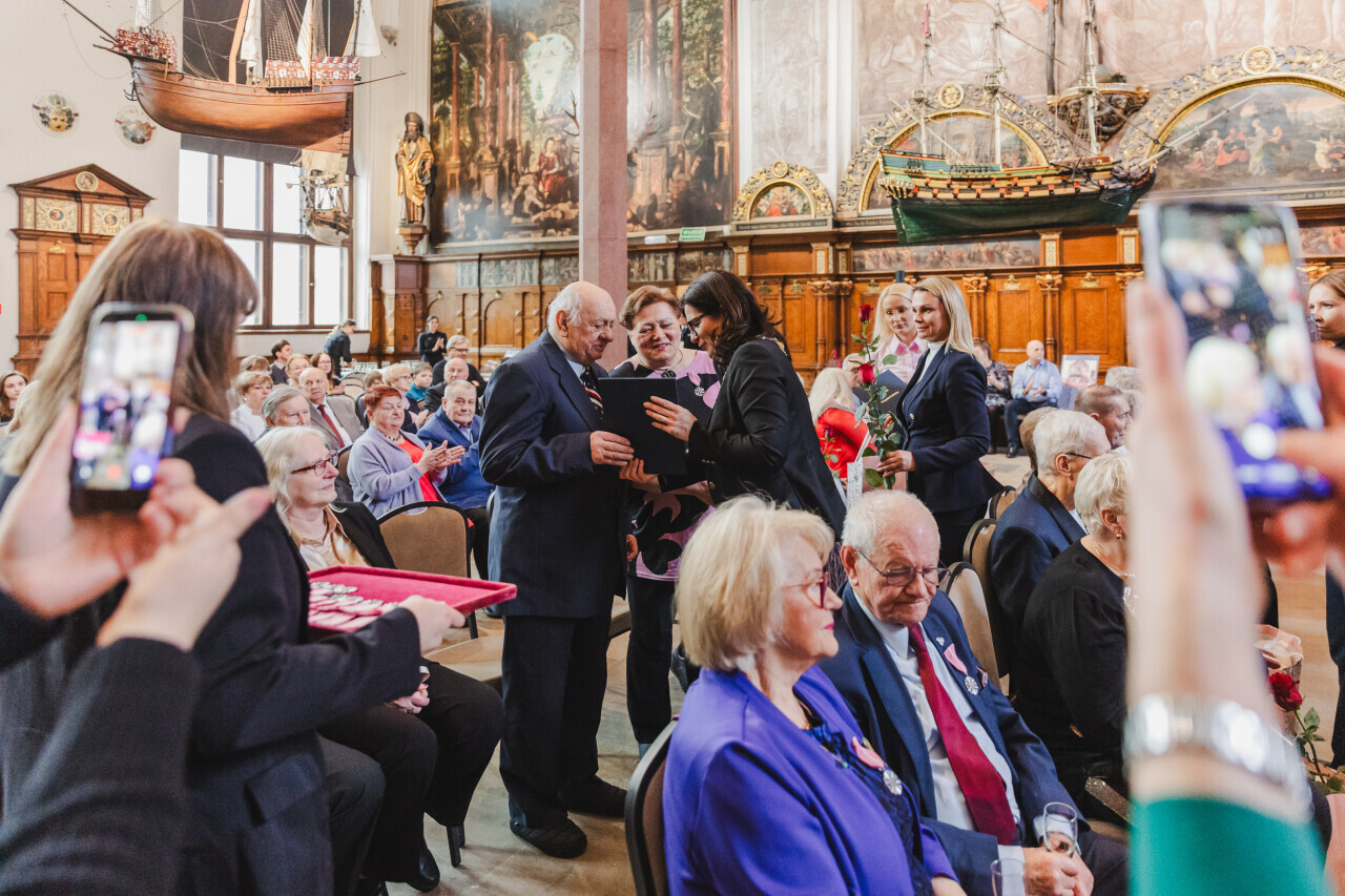 Gdańsk. Dwór Artusa. Jubileusz Par Małżeńskich - Złote Gody, podczas których Prezydent Gdańska Aleksandra Dulkiewicz wręczyła medale za długoletnie pożycie małżeńskie