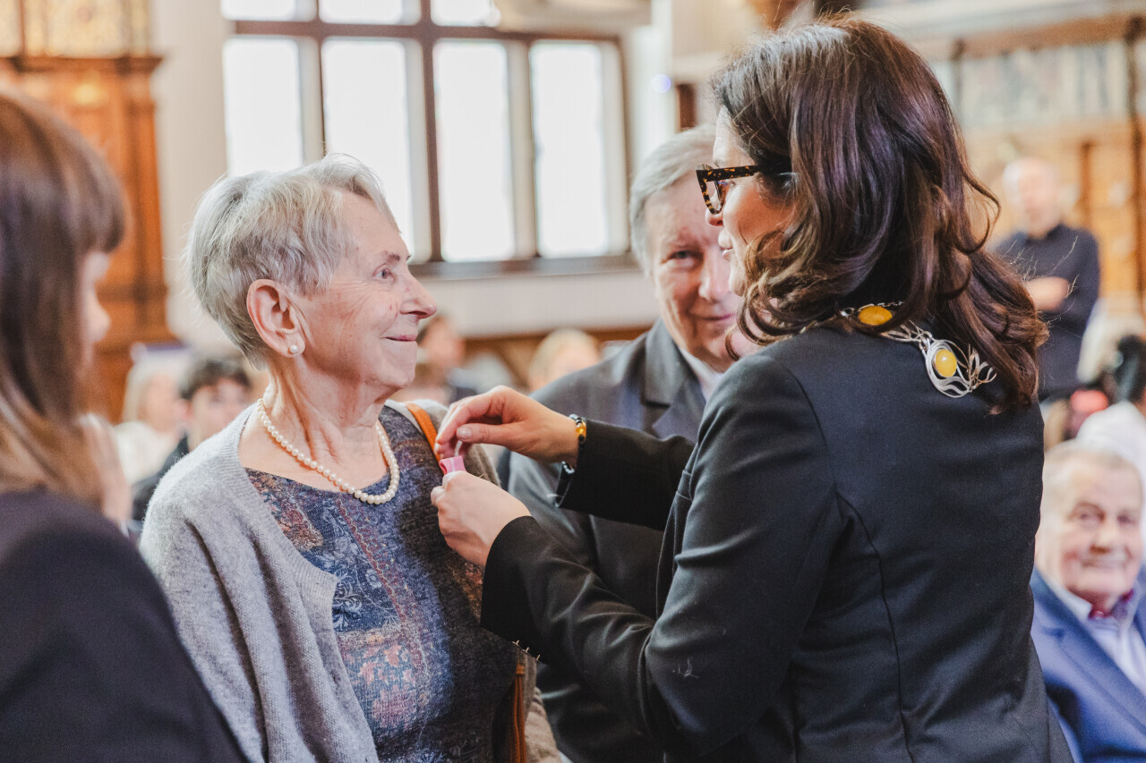 Gdańsk. Dwór Artusa. Jubileusz Par Małżeńskich - Złote Gody, podczas których Prezydent Gdańska Aleksandra Dulkiewicz wręczyła medale za długoletnie pożycie małżeńskie