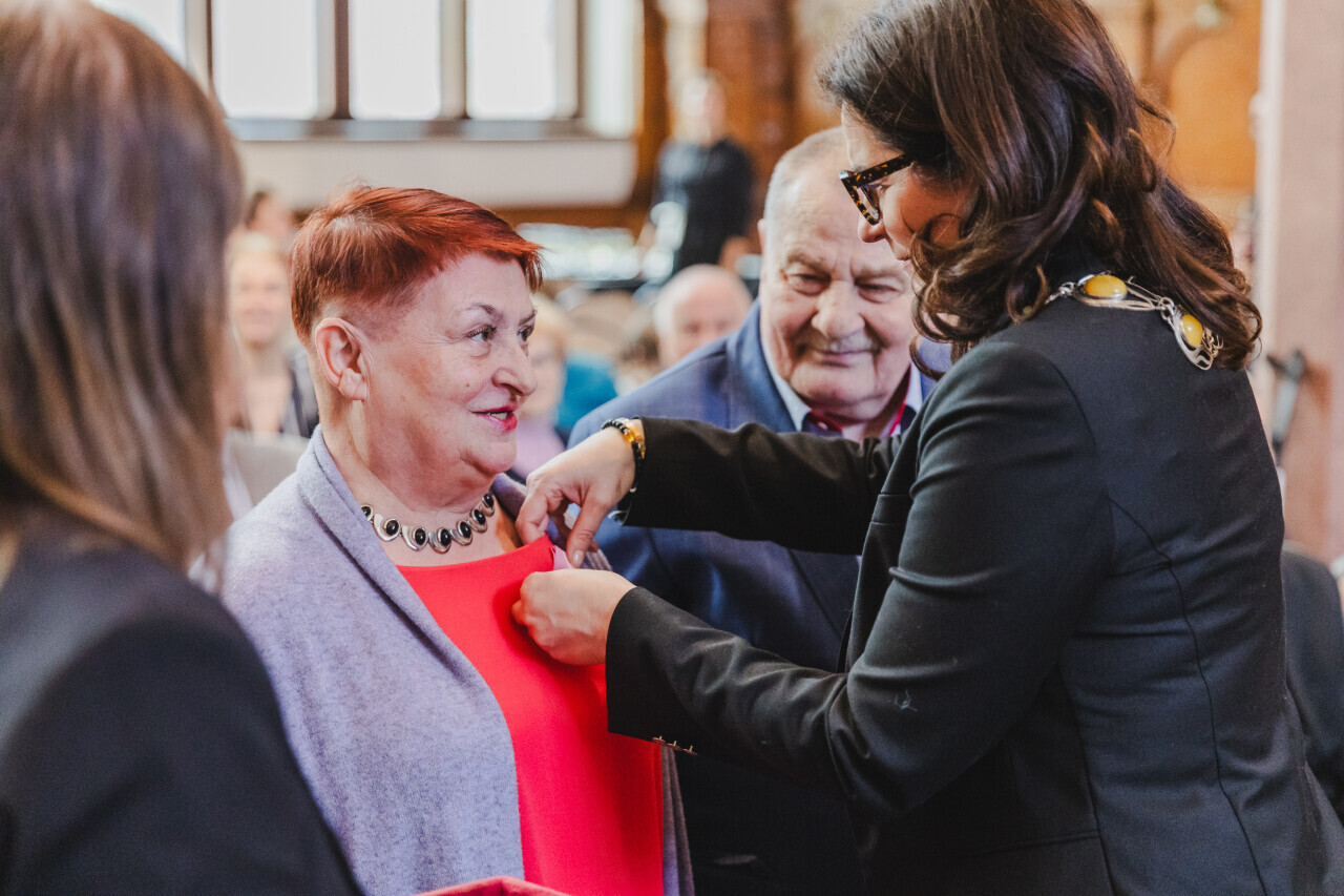 Gdańsk. Dwór Artusa. Jubileusz Par Małżeńskich - Złote Gody, podczas których Prezydent Gdańska Aleksandra Dulkiewicz wręczyła medale za długoletnie pożycie małżeńskie