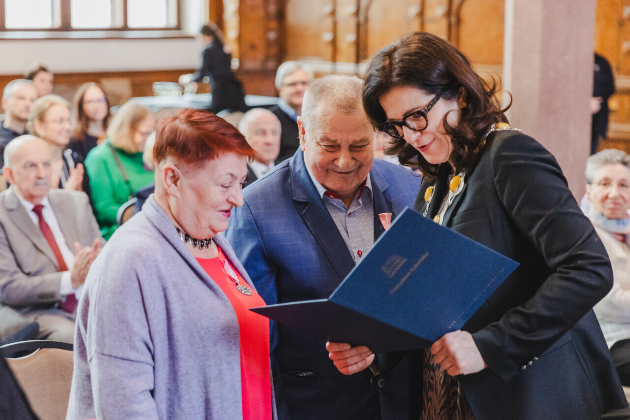Gdańsk. Dwór Artusa. Jubileusz Par Małżeńskich - Złote Gody, podczas których Prezydent Gdańska Aleksandra Dulkiewicz wręczyła medale za długoletnie pożycie małżeńskie