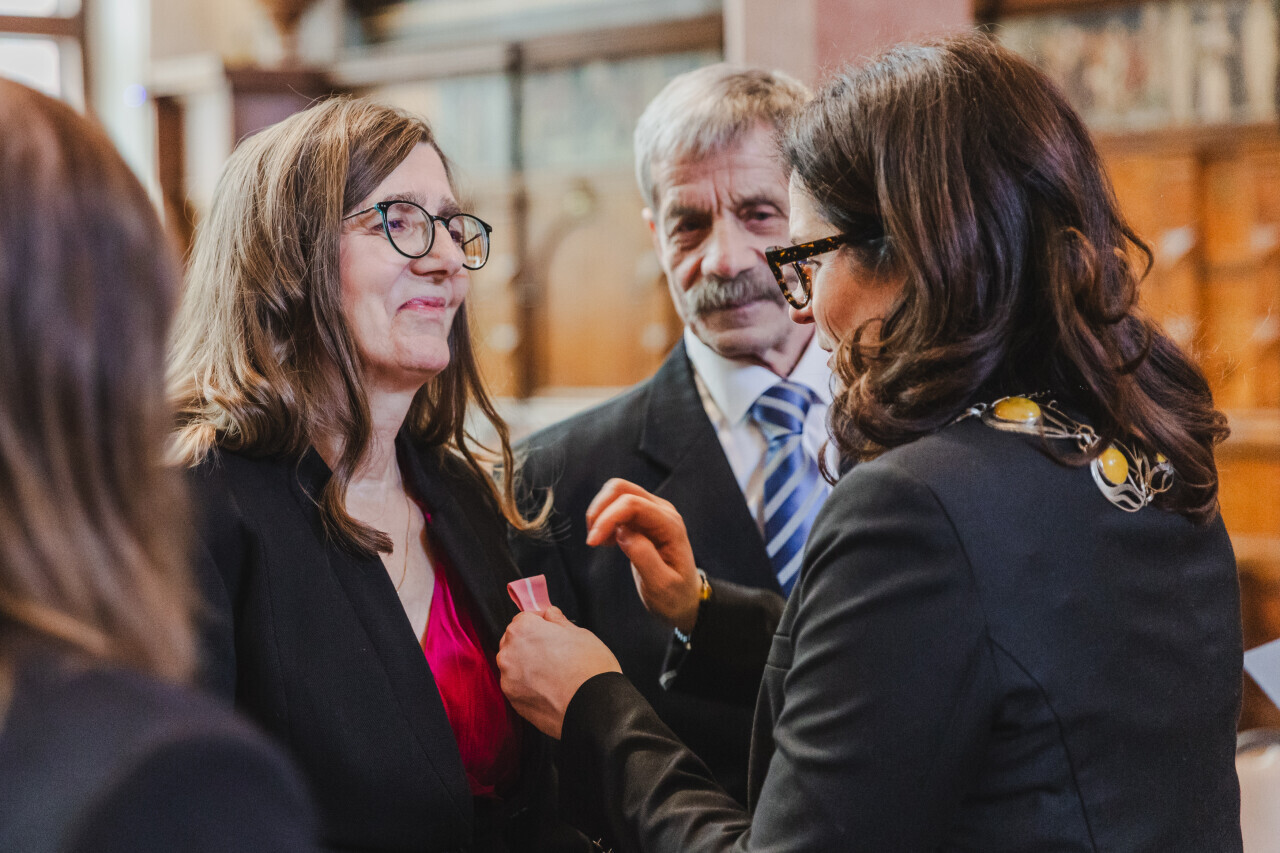 Gdańsk. Dwór Artusa. Jubileusz Par Małżeńskich - Złote Gody, podczas których Prezydent Gdańska Aleksandra Dulkiewicz wręczyła medale za długoletnie pożycie małżeńskie
