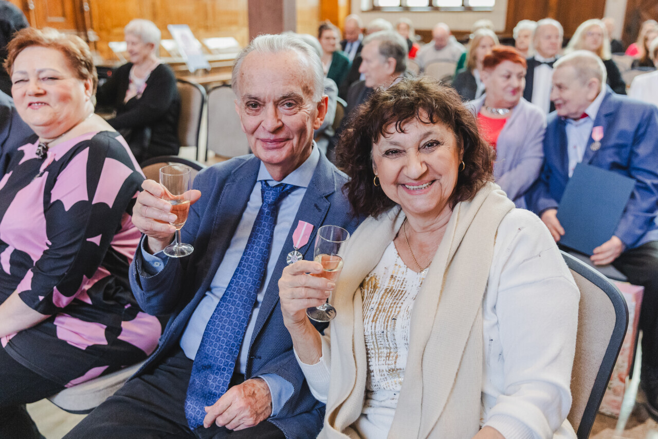 Gdańsk. Dwór Artusa. Jubileusz Par Małżeńskich - Złote Gody, podczas których Prezydent Gdańska Aleksandra Dulkiewicz wręczyła medale za długoletnie pożycie małżeńskie
