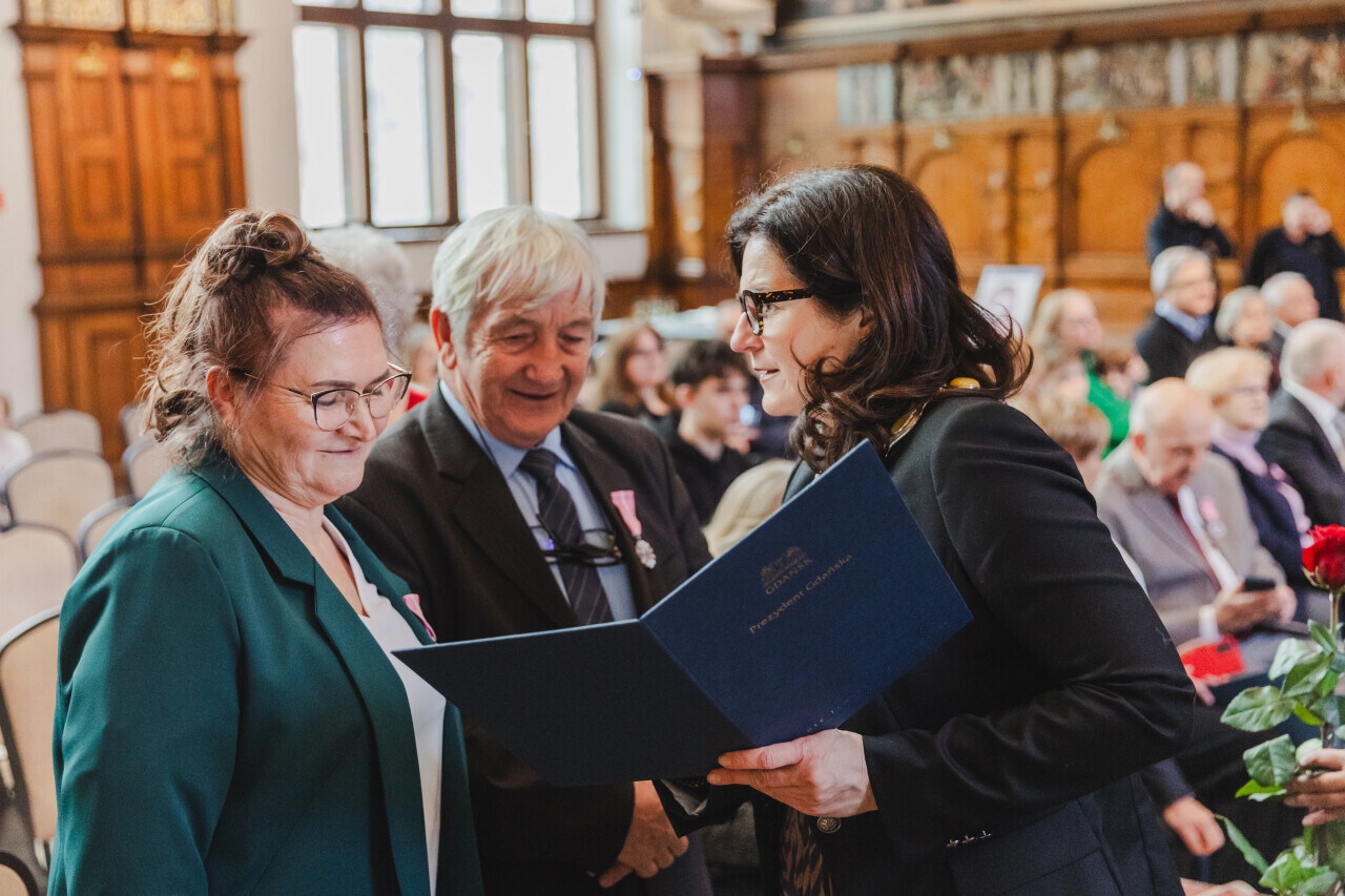 Gdańsk. Dwór Artusa. Jubileusz Par Małżeńskich - Złote Gody, podczas których Prezydent Gdańska Aleksandra Dulkiewicz wręczyła medale za długoletnie pożycie małżeńskie