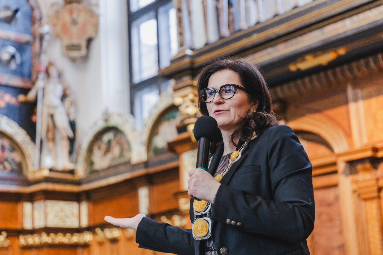 Gdańsk. Dwór Artusa. Jubileusz Par Małżeńskich - Złote Gody, podczas których Prezydent Gdańska Aleksandra Dulkiewicz wręczyła medale za długoletnie pożycie małżeńskie