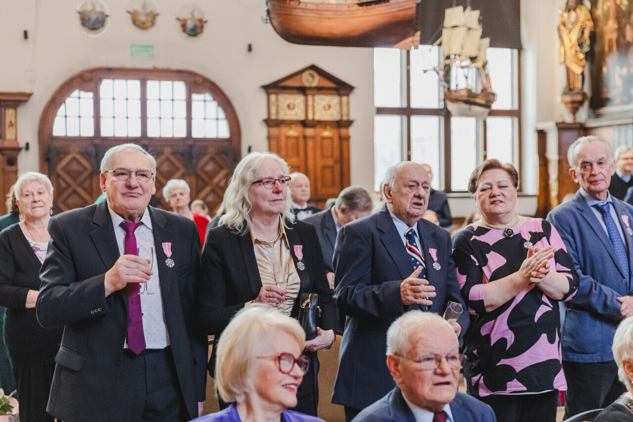Gdańsk. Dwór Artusa. Jubileusz Par Małżeńskich - Złote Gody, podczas których Prezydent Gdańska Aleksandra Dulkiewicz wręczyła medale za długoletnie pożycie małżeńskie