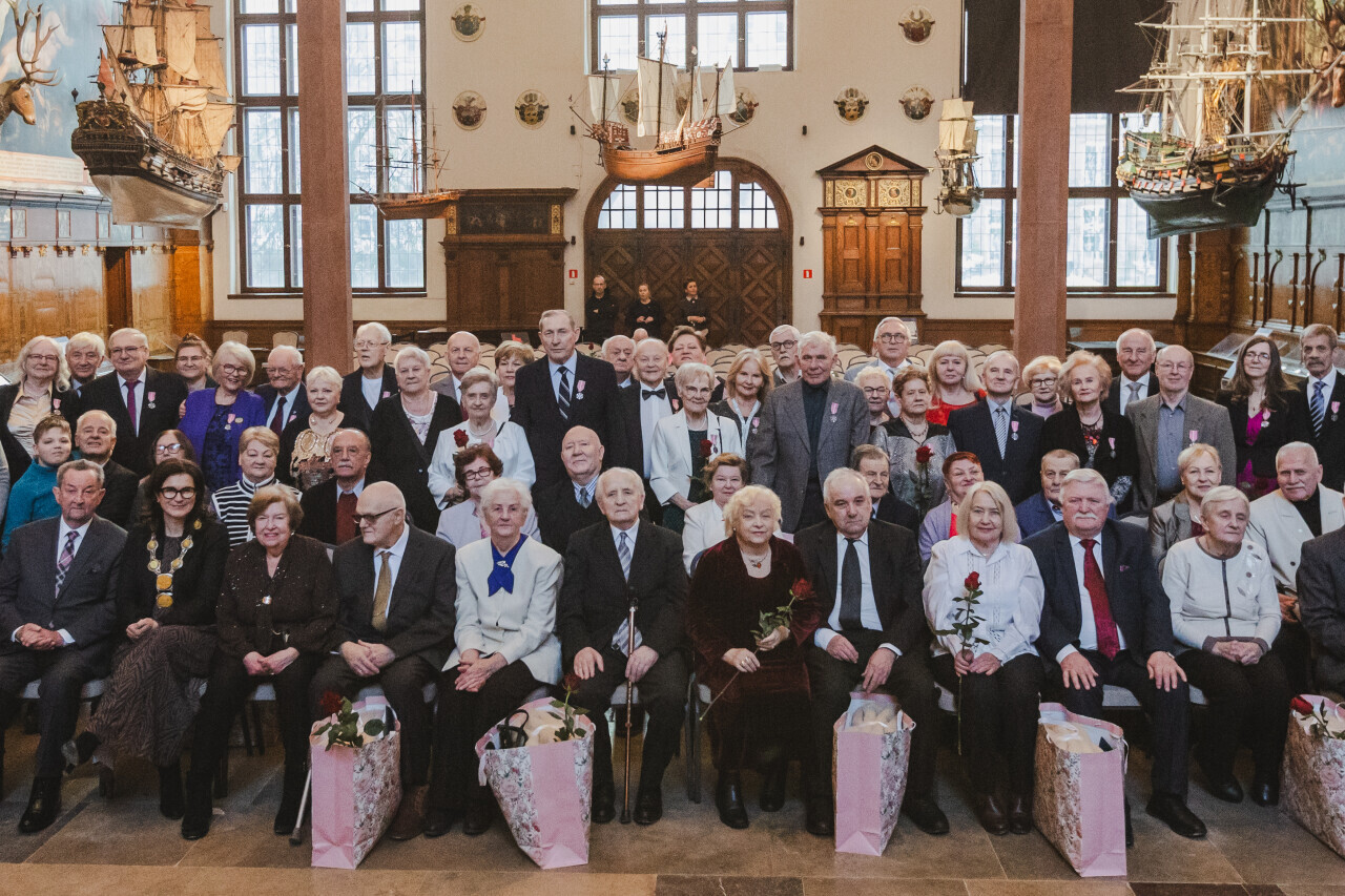 Gdańsk. Dwór Artusa. Jubileusz Par Małżeńskich - Złote Gody, podczas których Prezydent Gdańska Aleksandra Dulkiewicz wręczyła medale za długoletnie pożycie małżeńskie