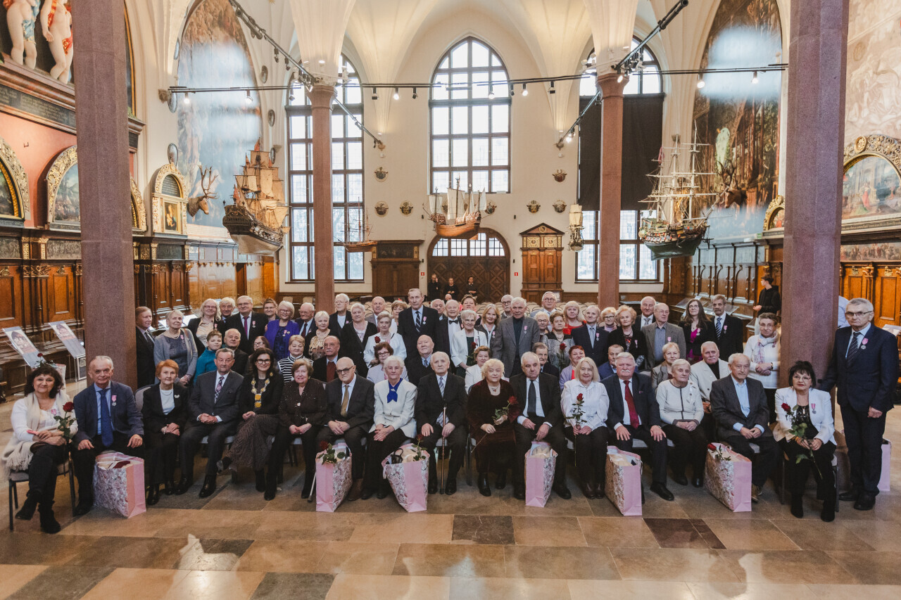 Gdańsk. Dwór Artusa. Jubileusz Par Małżeńskich - Złote Gody, podczas których Prezydent Gdańska Aleksandra Dulkiewicz wręczyła medale za długoletnie pożycie małżeńskie