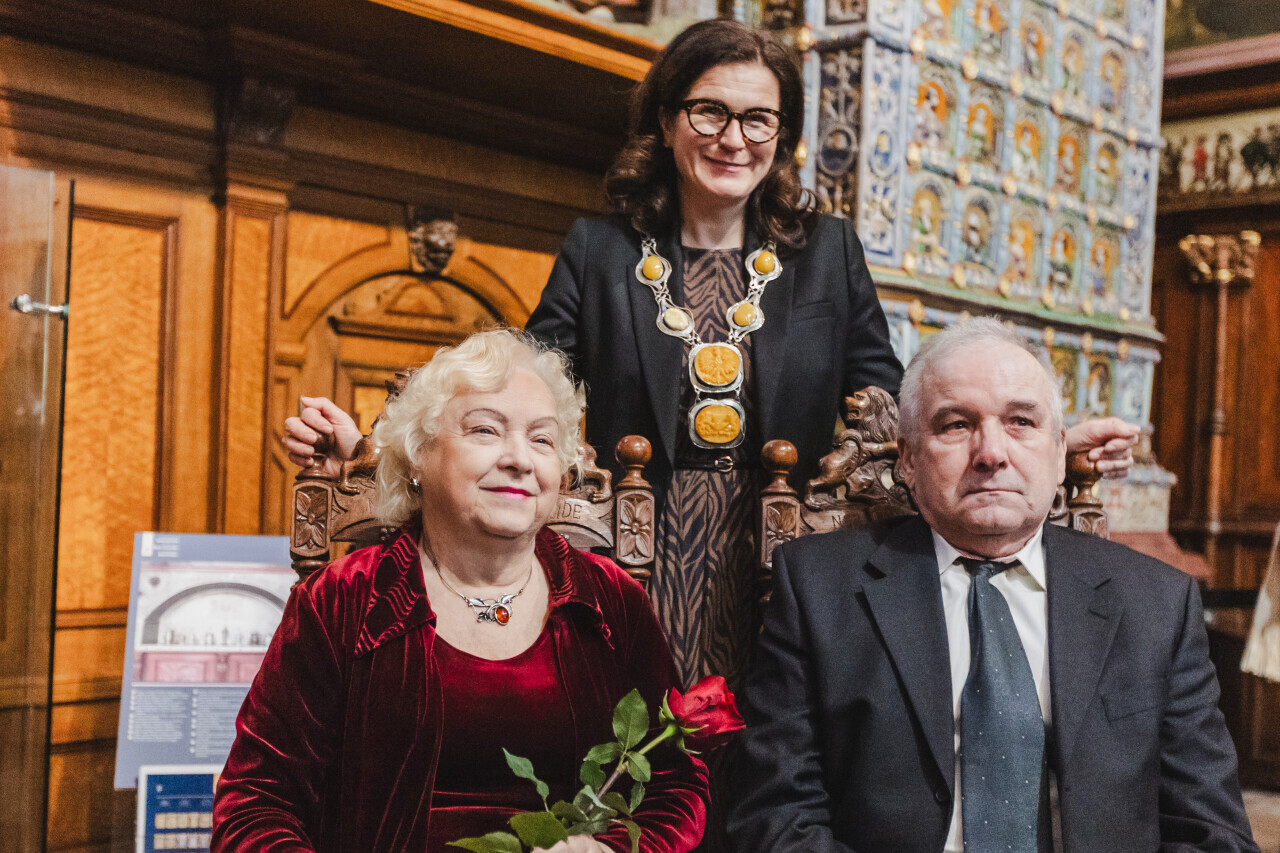 Gdańsk. Dwór Artusa. Jubileusz Par Małżeńskich - Złote Gody, podczas których Prezydent Gdańska Aleksandra Dulkiewicz wręczyła medale za długoletnie pożycie małżeńskie