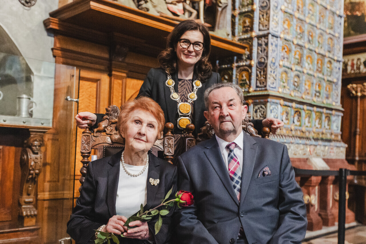 Gdańsk. Dwór Artusa. Jubileusz Par Małżeńskich - Złote Gody, podczas których Prezydent Gdańska Aleksandra Dulkiewicz wręczyła medale za długoletnie pożycie małżeńskie