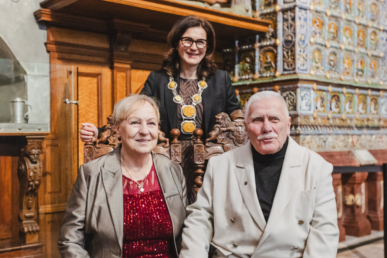 Gdańsk. Dwór Artusa. Jubileusz Par Małżeńskich - Złote Gody, podczas których Prezydent Gdańska Aleksandra Dulkiewicz wręczyła medale za długoletnie pożycie małżeńskie